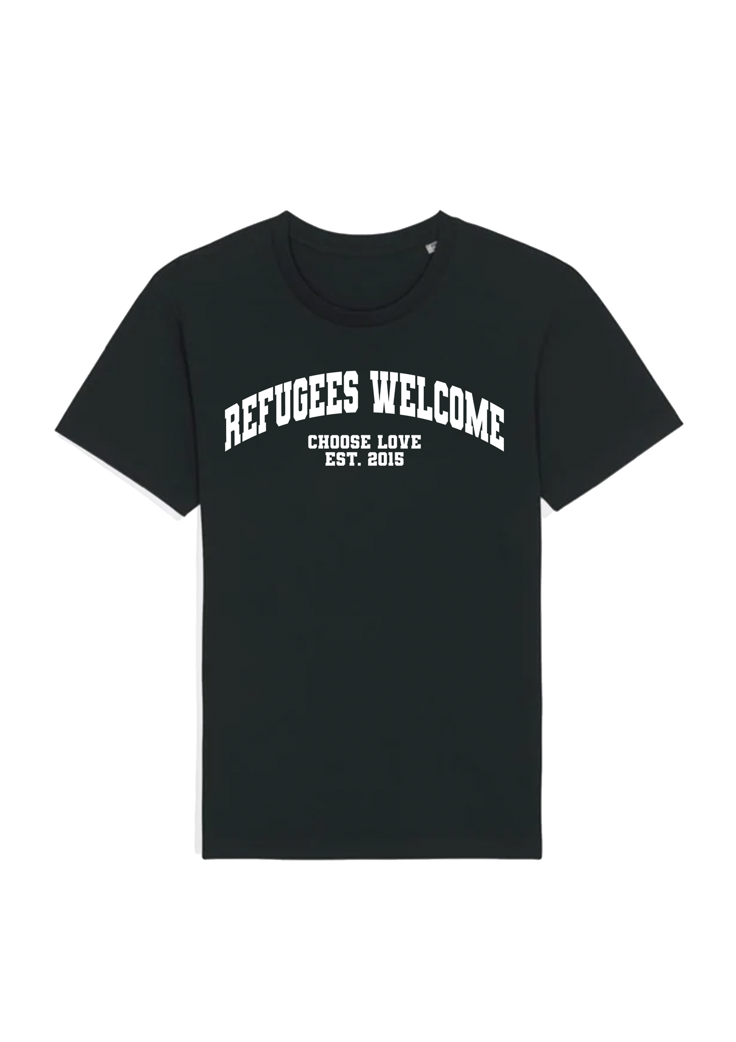 Refugees welcome range, print logo tee. 100% Organic compact ringspun cotton single Jersey.