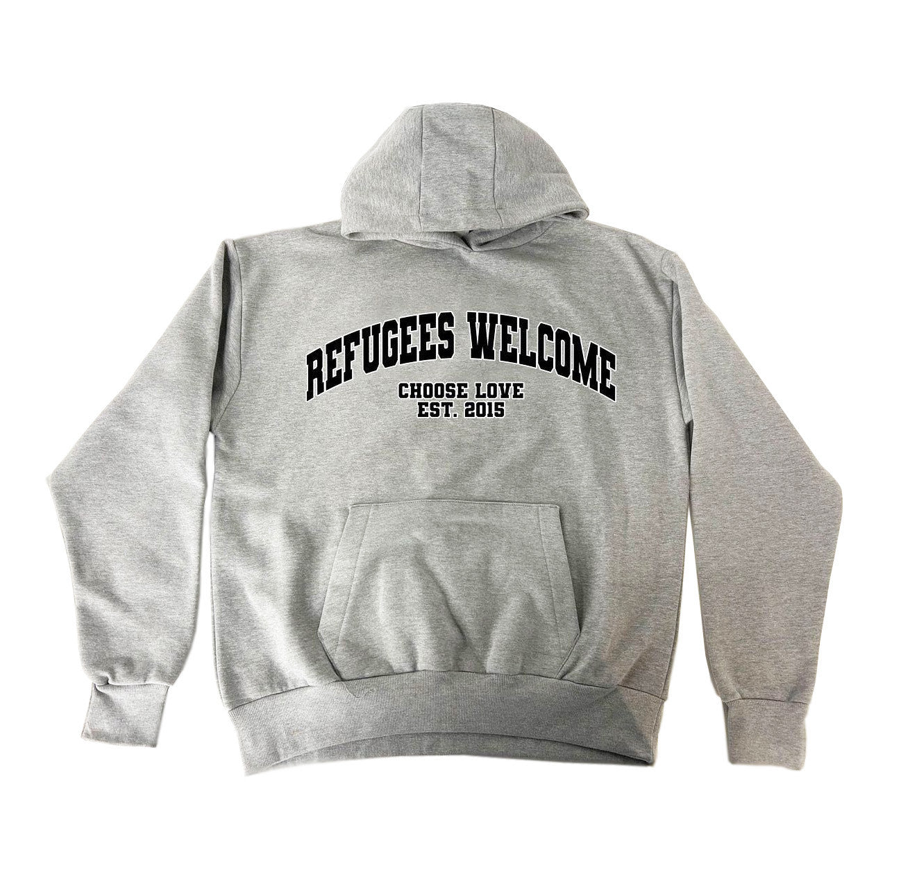 Refugees welcome range, with logo in puff print. Heather Grey: Organic cotton. 440gsm Available in sizes XS - XXXL