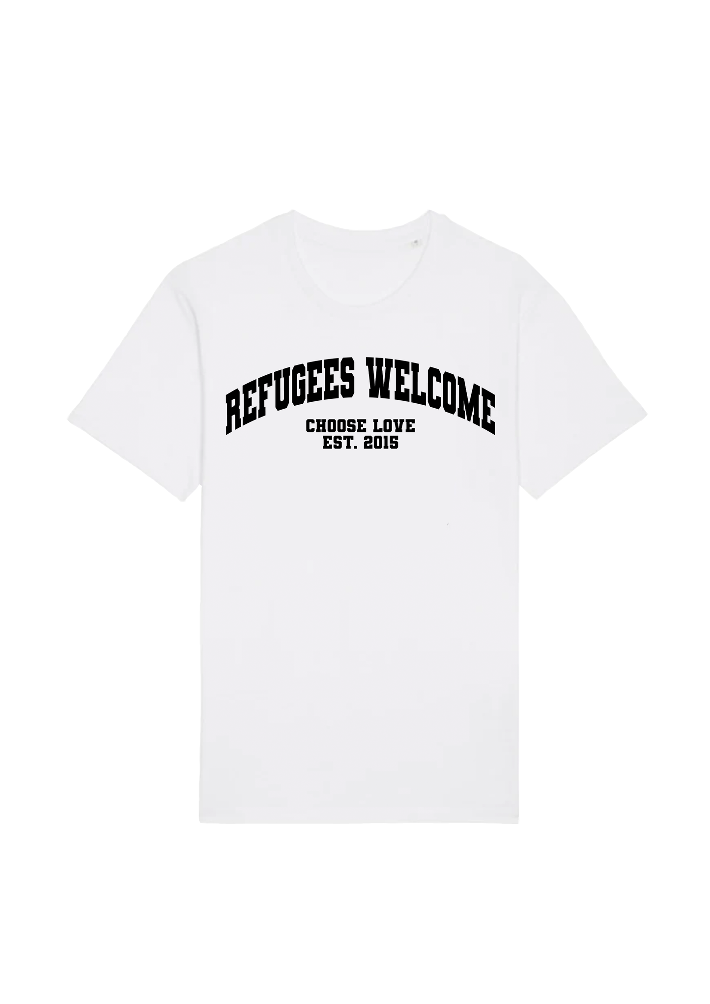 Refugees welcome range, print logo tee. 100% Organic compact ringspun cotton single Jersey. Available in sizes XS-XXXL.